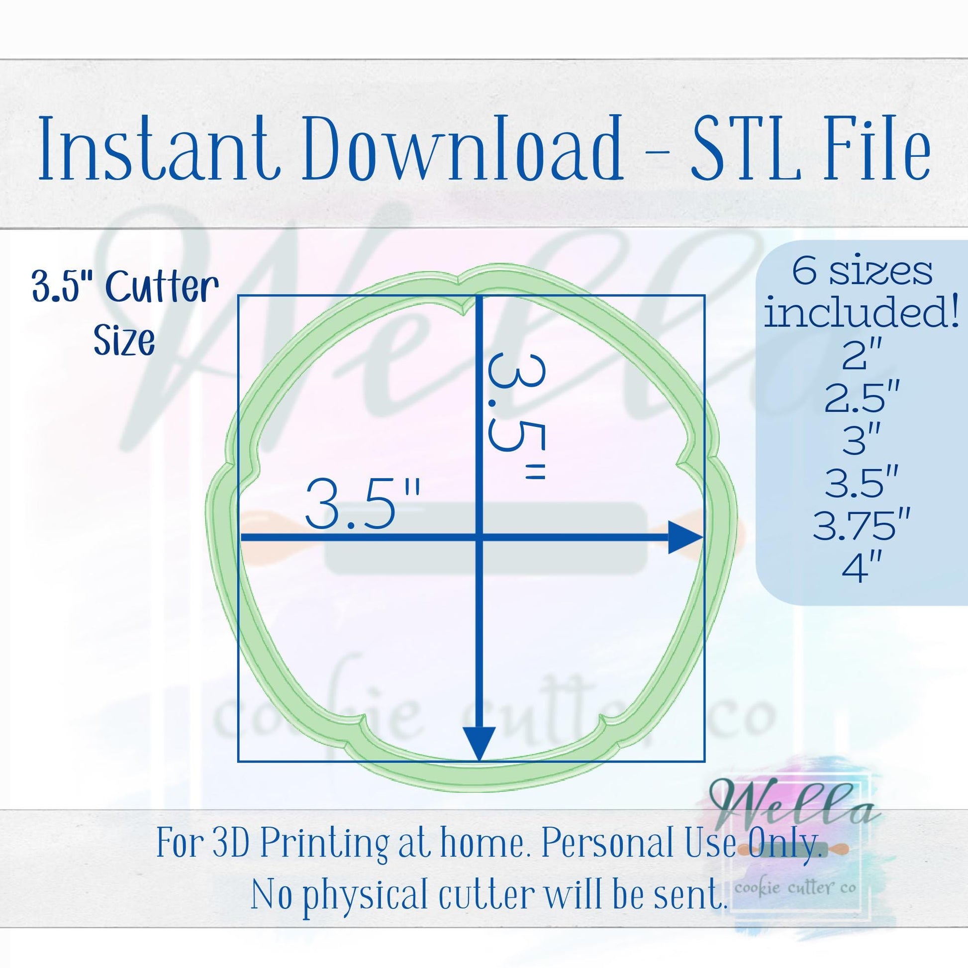 This is an instant download. No Reselling or Sharing. This is for Personal Use Only. For 3D printing at home. No physical cutter will be sent. This cutter was hand drawn by Wella Cookie Cutter Co. Not purchased from clipart. Do not recreate. The cutter has a bar across the middle with the name of the design.